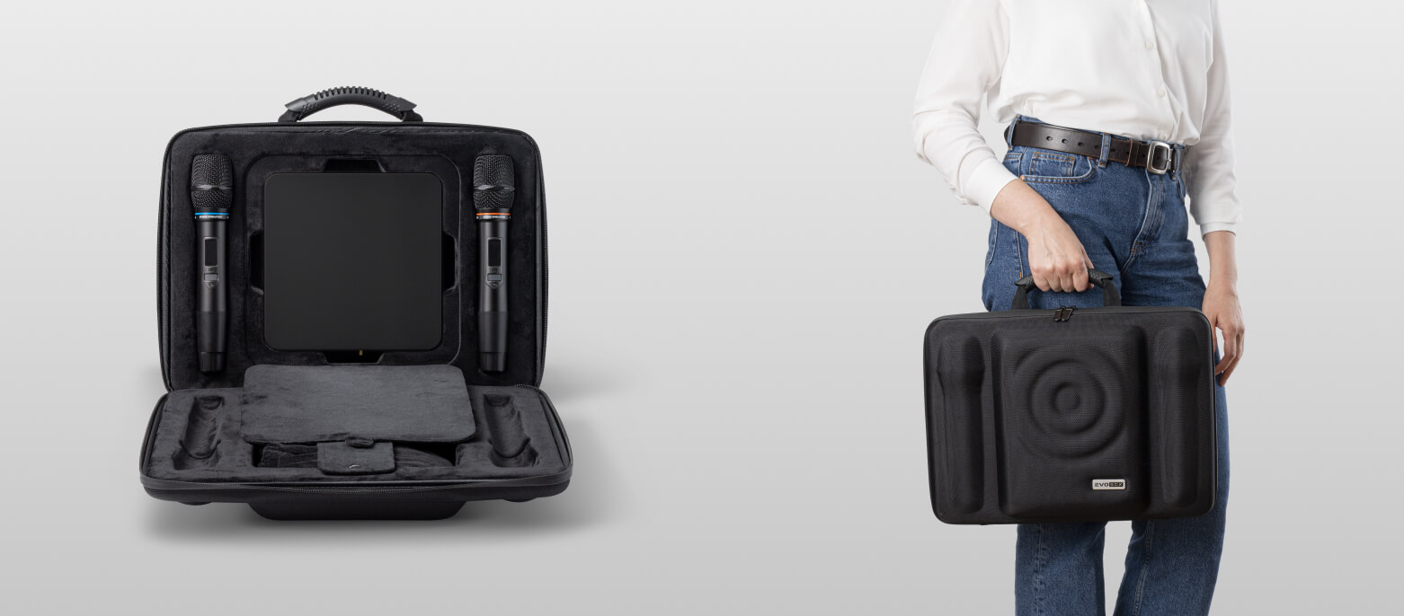 Guarda y transporta tu karaoke cómodamente en el resistente estuche que viene incluido en el paquete. El elegante EvoCase está especialmente diseñado para EVOBOX Plus Black y puede almacenar el sistema de karaoke con los micrófonos, el control remoto y los accesorios. Tu equipo de karaoke estará protegido de arañazos, humedad y polvo en este estuche compacto. El estuche de karaoke junto con el sistema es un regalo original y valioso que será recordado para siempre.