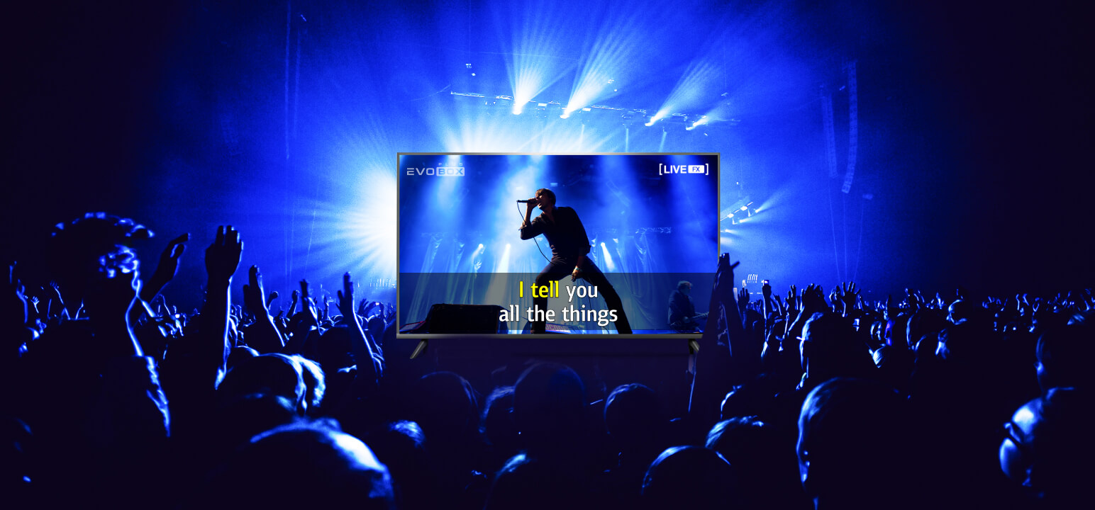 Una innovadora función exclusiva para los propietarios del sistema de karaoke EVOBOX es el efecto de actuación en vivo LiveFX. El efecto LiveFX es único para cada canción y crea una atmósfera de actuación en vivo en un espectáculo, estadio o reunión. Ahora en tu fiesta de karaoke en casa, podrás disfrutar de aplausos entusiastas, apoyo de la audiencia y sonido de concierto.
