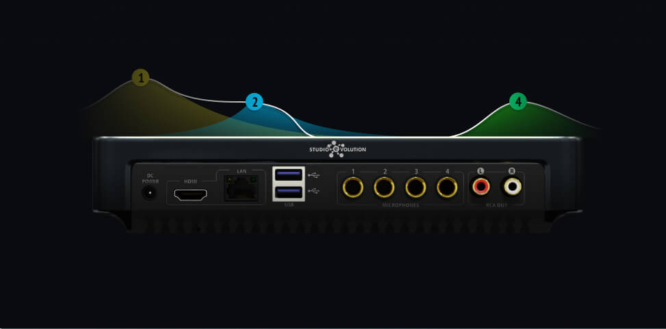 Puedes conectar 4 micrófonos a EVOBOX Premium Black. ¡Canta en solitario, a dúo, trío e incluso en cuarteto! Activa los efectos vocales, ajusta el nivel de volumen de cada micrófono o utiliza la ecualización para afinar el sonido de manera precisa.